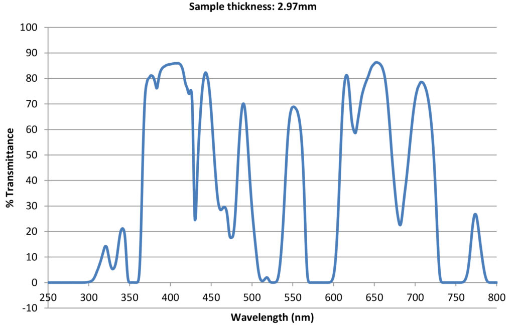 Phillips 202 Glass is very efficient in filtering sodium flare in addition to providing ultraviolet protection to 390 nm. The Phillips 202 is becoming a preferable choice of hot glass workers. It is very comfortable for viewing under high ambient light conditions such as when working with hot glass or glowing heat sources for a duration of time. Also, although it has a relatively low luminous transmission of 27%, it is not recommended for sun protection use unless UV filtering coatings are applied.